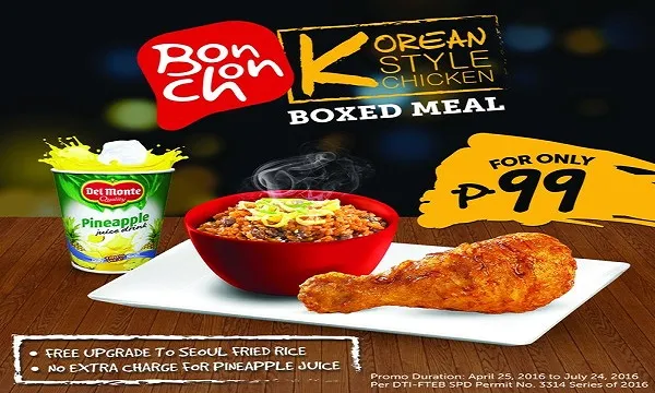 BonChon Philippines is offering free upgrades to Seoul fried rice and is giving extra charge for pineapple juice for all KStyle boxed meal orders